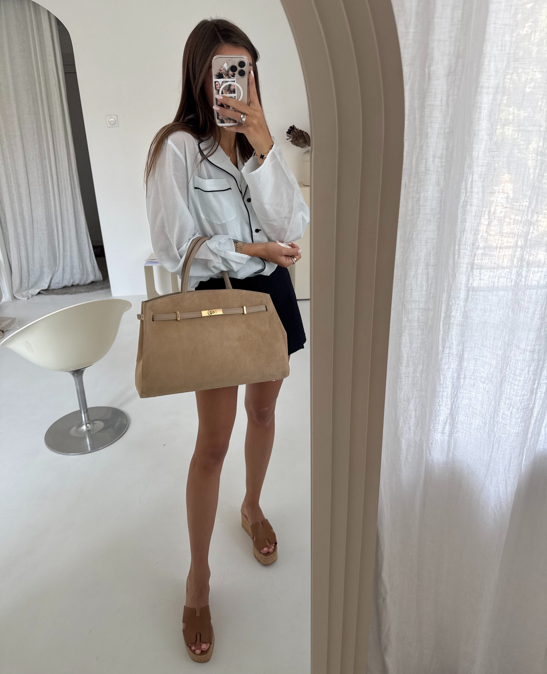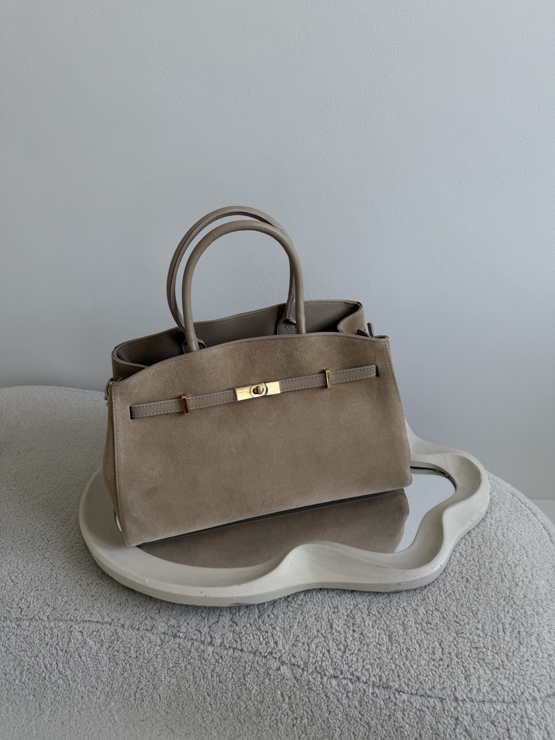 Zamszowa torebka w odcieniu ecru z eleganckim złotym zapięciem. Jednokomorowa, z małą kieszonką na zamek w środku. W zestawie odpinany pasek na ramię. Stylowa, funkcjonalna i idealna na każdą okazję.